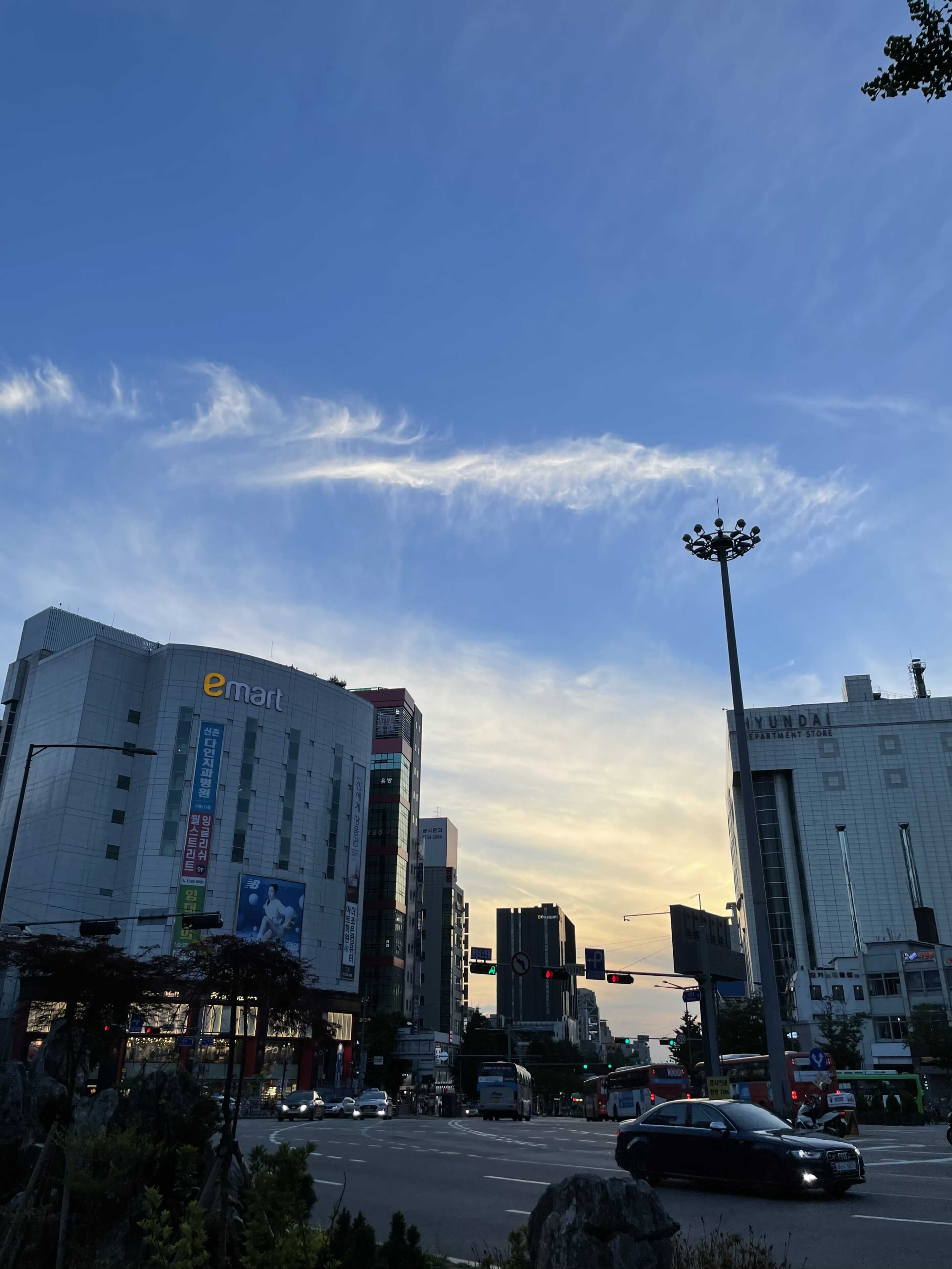 출발은 신촌에서 했다. 자칭 신촌 전문가 친구가 데려가는 곳에서 저녁을 (오겹살을 좀 많이) 먹고 따릉이를 잡아타고 출발했다. 일곱시 반 쯤 출발한 것 같은데, 여름이라 그런지 해가 길어 아직도 밝았다. 건물 사이로 살짝 보이는 노을이 뭔가 한국만의 감성이라 찍어봄.